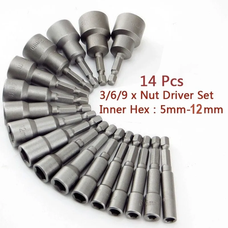 14Pcs 5-12mm Hexagon Nut Driver Drill Bit Socket Screwdriver Wrench Set Drill Bit Adapter for Electric Screwdriver Handle Tools