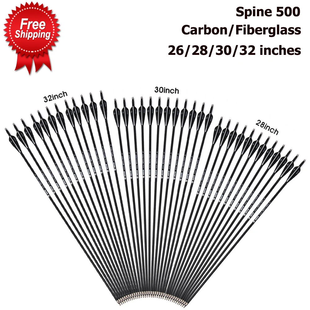 26/28/30/32 inches Spine 500 Carbon/Fiberglass Arrow with Black and White Color for Recurve/Compound Bows Archery Hunting
