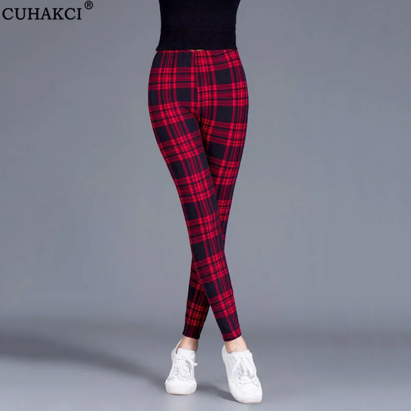 CUHAKCI Female Fitness Leggings Women Print Plaid Leggings Lady Sexy Slim Pencil Pants Push Up Elastic Waist Plus Size Trousers