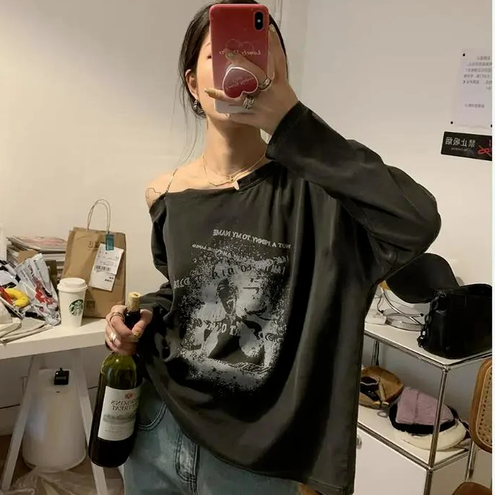 Women Vintage Print T-shirt Fairy Grunge 2021 New Autumn Long Sleeved Cool Girl Rock Strapless Tees Loose Harajuku Tops