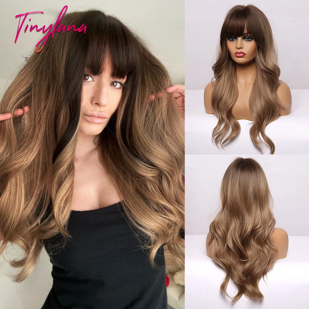 TINY LANA Long Ombre Black Brown Synthetic Wigs with Bangs Natural Wave Hairstyle for Women Cosplay Party Heat Resistant Fiber