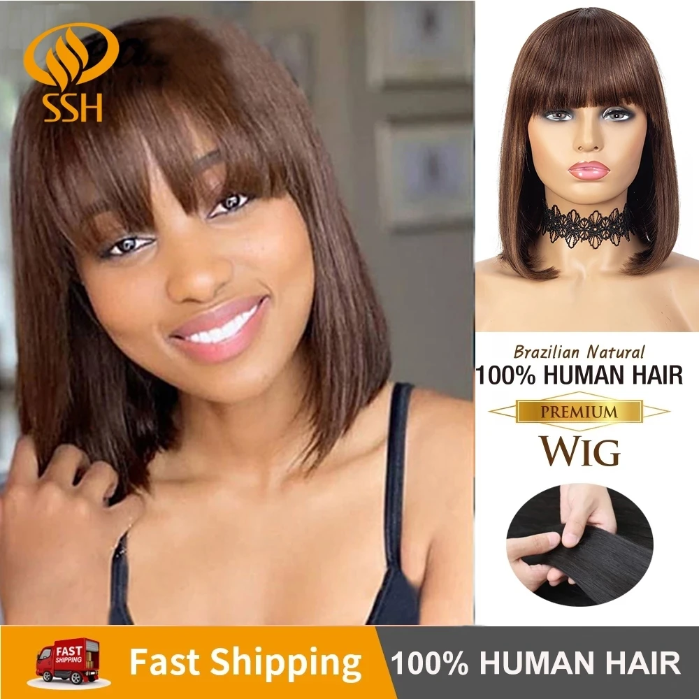 SSH Short Human Hair Wig with Fringe for Women Straight Remy Hair Bob Wigs With Bangs Dark Brown Balayage Highlight Ombre Color