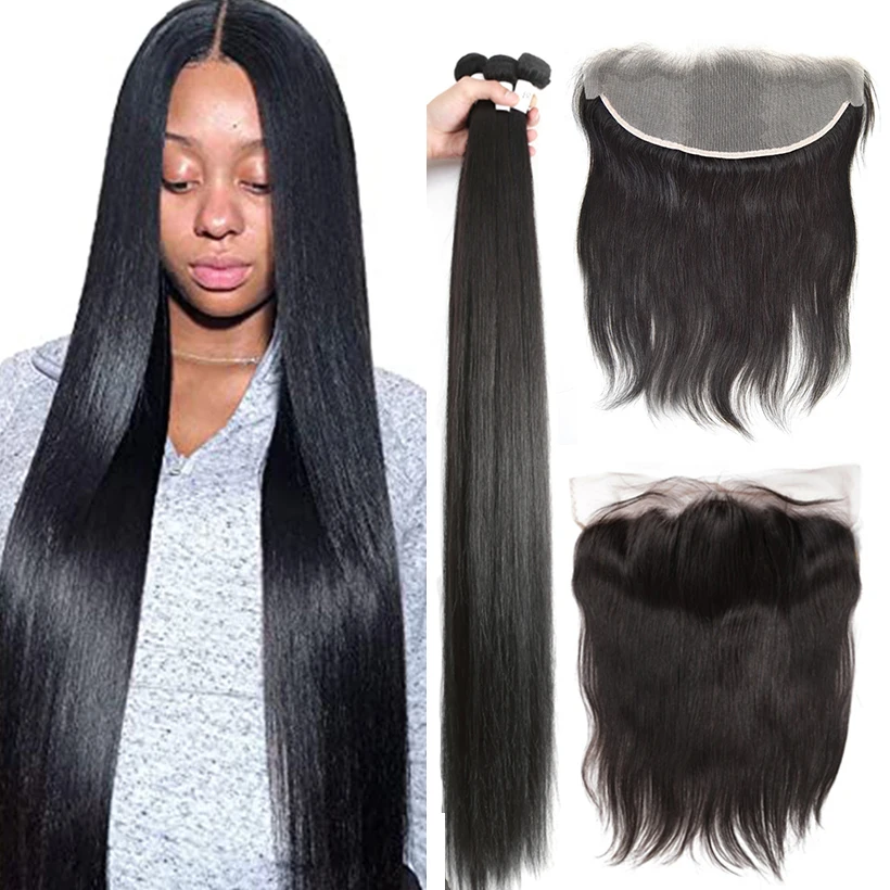 Brazilian Straight Remy Hair 36 40 Inch Human Hair Bundles With 13X4 Lace Frontal Promqueen Human Hair Ear To Ear 4X4 Closure