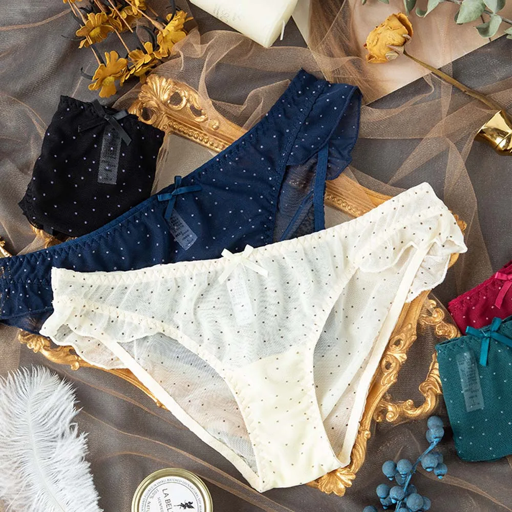NEW Fashion Bow Lace Ruffles Briefs Polka Dot Print Cotton Crotch Panties Sexy Breathable Transparent Mesh Thong For Women