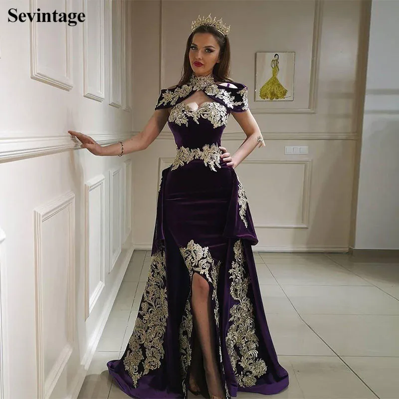 Sevintage High Neck Mermaid 3 Pieces Evening Dress with Overskirt Velour Gold Lace Formal Dress vestido de noiva Algerian Outfit