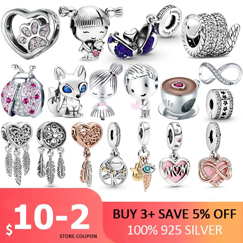 100% 925 Sterling SILVER charms Paw Footprints Beads Cat Love Heart Charms fit Original Pan Bracelet silver 925 jewelry