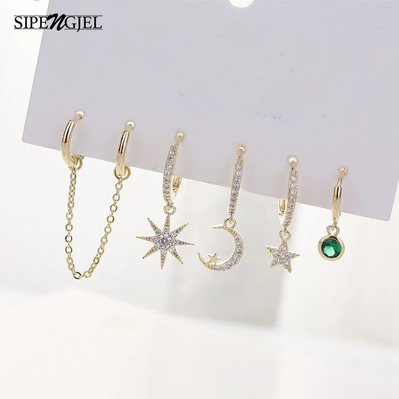 New Set Cute Star And Moon Small Hoop Earrings Sets Crystal Long Gold Chain Earrings For Women Fashion Jewelry Gift 2020 aretes