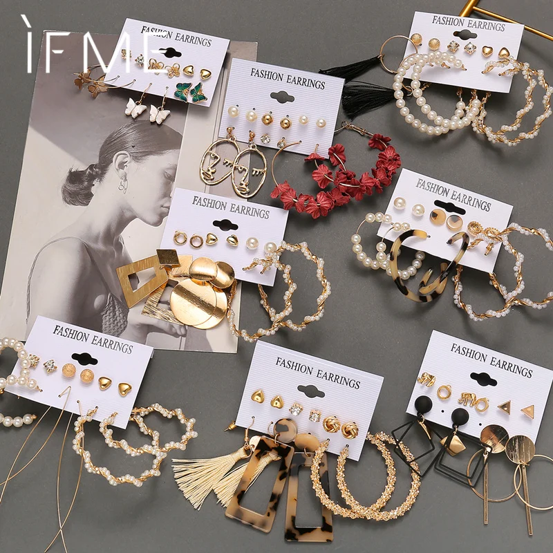 IF ME Vintage Earrings Set for Women Pearl Circle Drop Earring Gold Acrylic Geometric Metal Tassel Butterfly Trendy Jewelry 2021