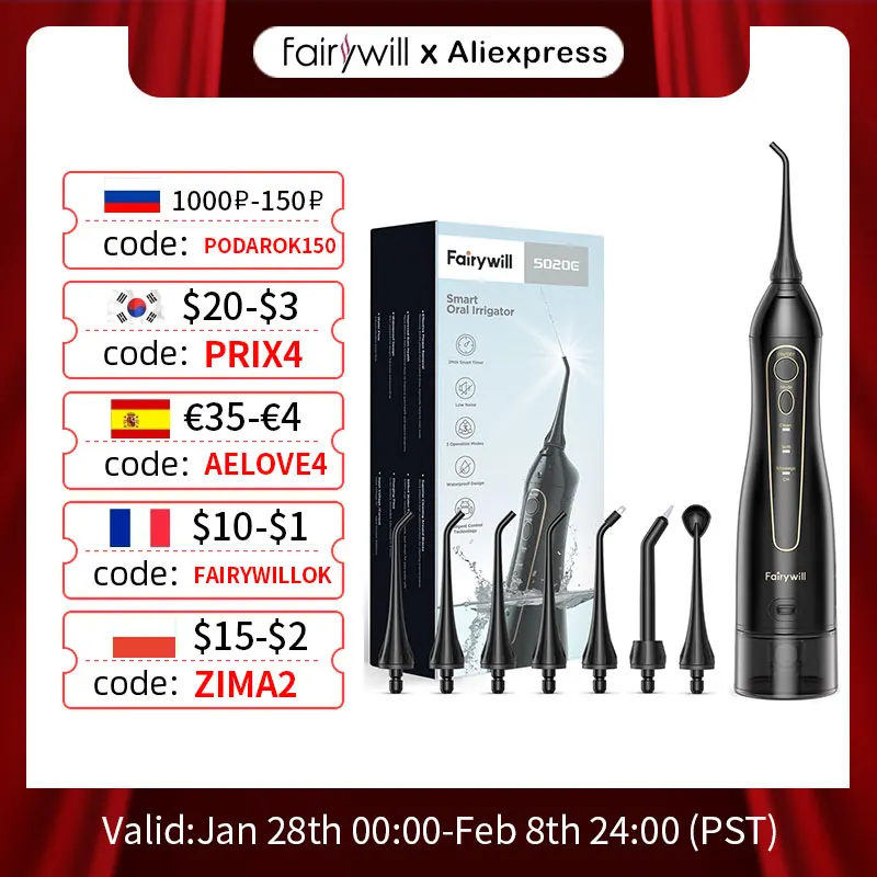 Fairywill Water Flossers for Teeth 300ML Oral Irrigator Rechargeable Portable Dental 3 Modes Water Tank Waterproof Teeth Cleaner