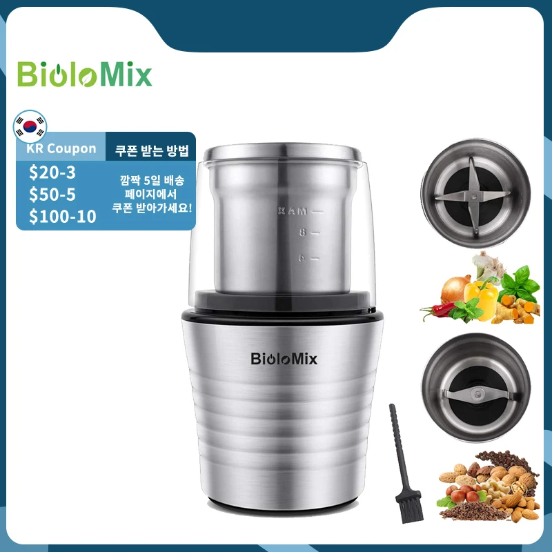BioloMix 2-in-1 Wet and Dry Double Cups 300W Electric Spices and Coffee Bean Grinder Stainless Steel Body and Miller Blades