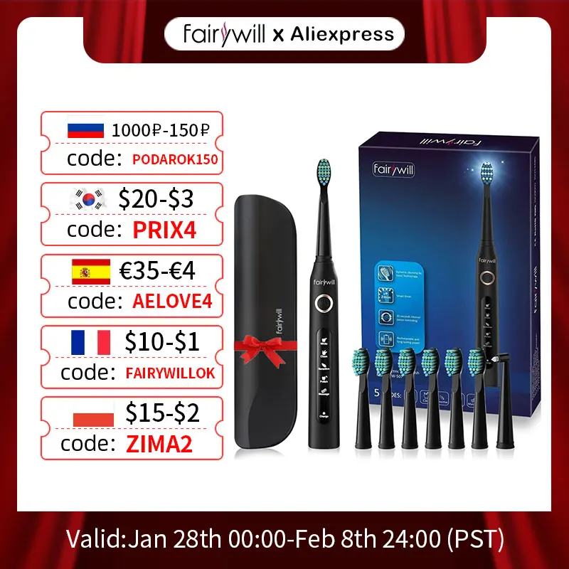 Fairywill Electric Sonic Toothbrush USB Charge FW-507 Rechargeable Waterproof Electronic Tooth Brushes Replacement Heads Adult