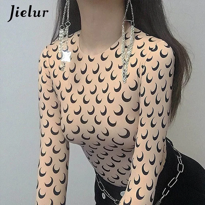 Jielur Moon Printed Long Sleeve Women T-shirts Slim Plus Size Basic Fashion 5 Colors Tshirt Female S-4XL Casual Tee Shirt Femme