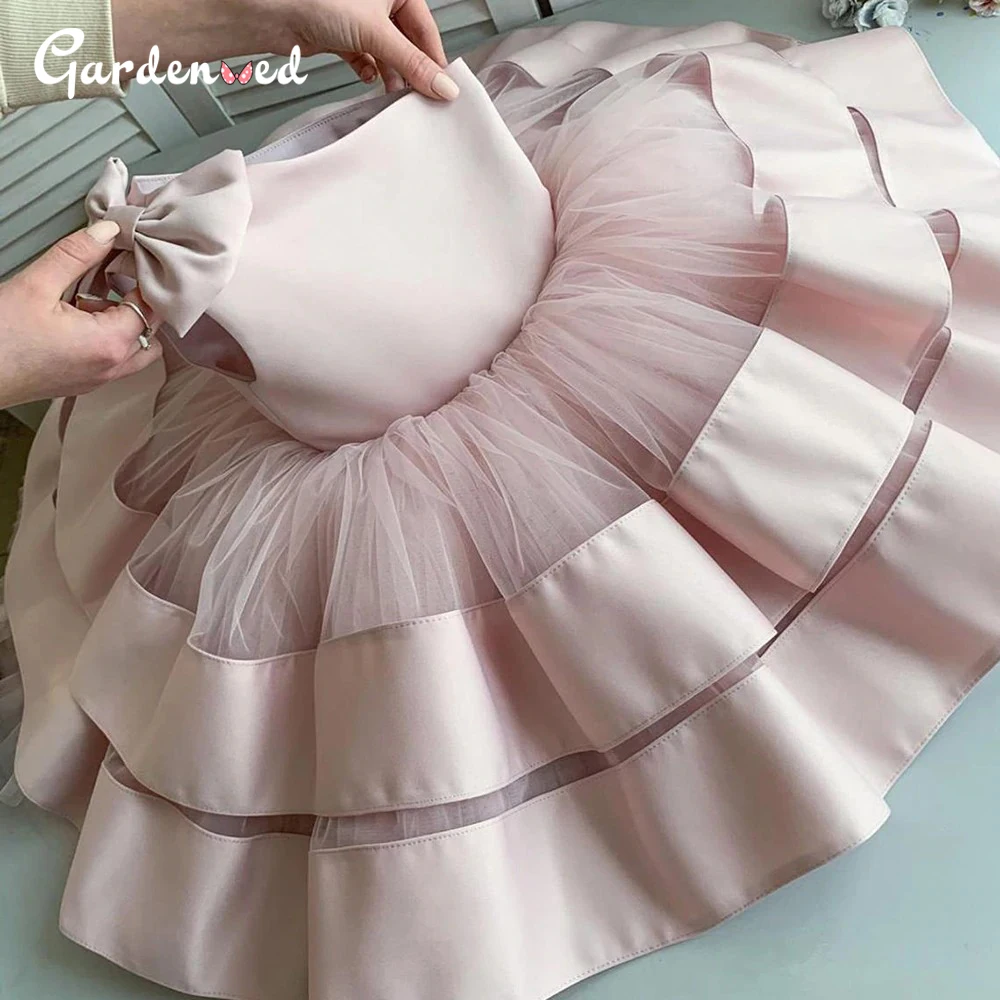 Puffy Layers Pink Flower Girl Dresses Satin Bow Kids Princess Dress Bow Shoulder Kids First Communion Dresses Birthday New Year