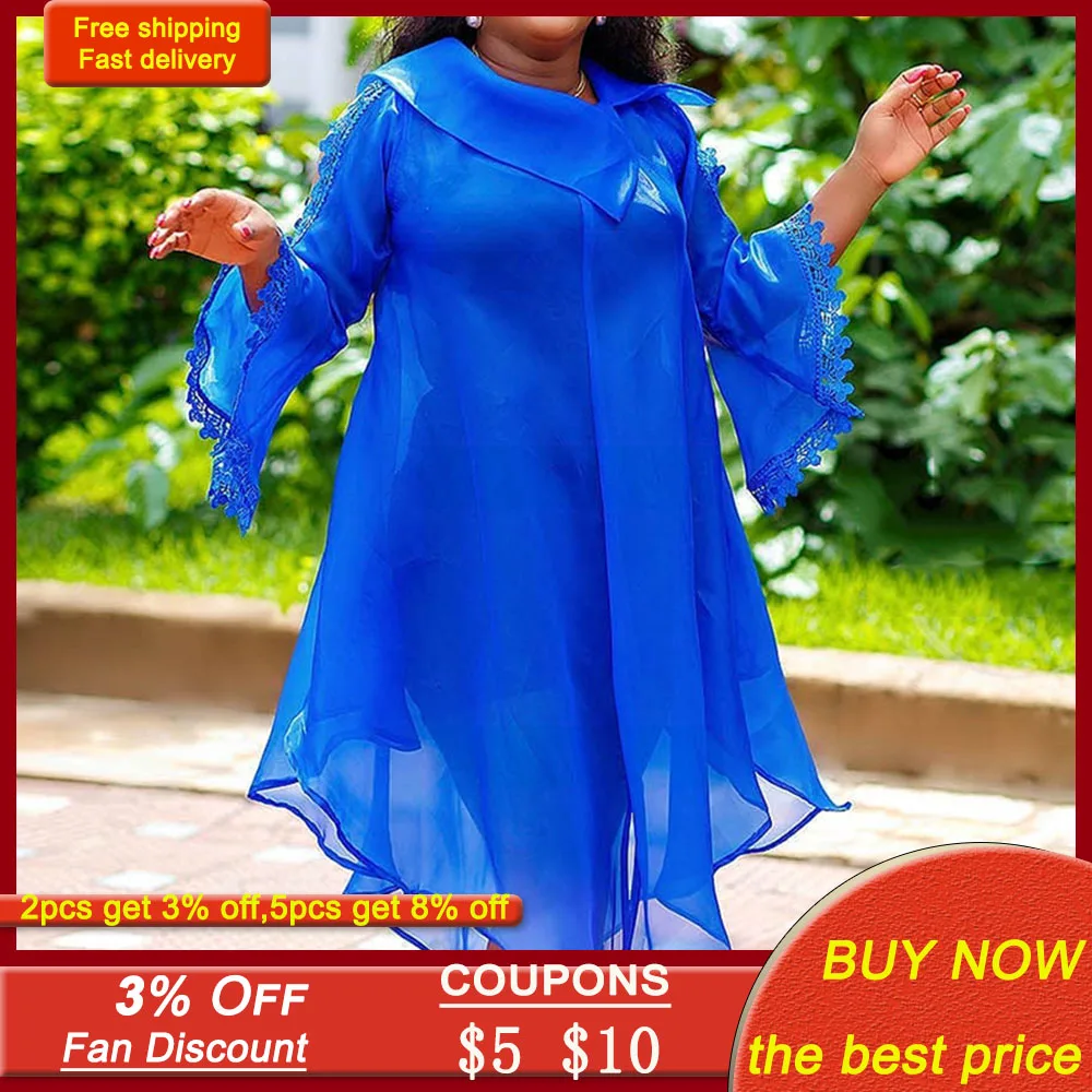 Blue Women Midi Dress Autumn Fall 2020 Asymmetrical Flare Long Sleeve Sheer Sexy Dresses Loose 5xl Plus Size See Through Casual